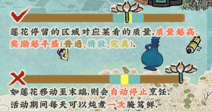 炖煮结果以活动界面上莲花停留的区域为准!炖煮质量越高,奖励越丰盛!