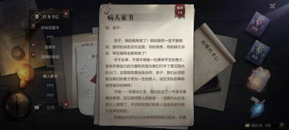 经过再三斟酌,你答应帮他们开启临时的治疗法阵,等回复安娅后再将调制好的药剂送给病人一部分,可当你风风火火赶回此处时,却发现失去治疗法阵加持的病人已经离世了,同时,你会发现一封病人留下的家书...