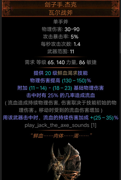 首先是dps方面,这把武器的大伤比传统的流血裂界斧子高了接近1/3,鲜血渴求提供了20more物理伤,自身又有35物理持续加成,在伤害上并不是很输于以前的黄斧头。