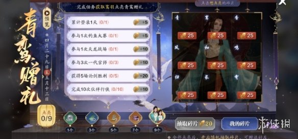 活动时间内完成任务池中的任务将获得对应数量的鸾羽奖励,每个任务限完成一次。鸾羽可用于在右侧奖池中点亮碎片,点亮相应数量的碎片后可在页面下方领取对应的奖励。