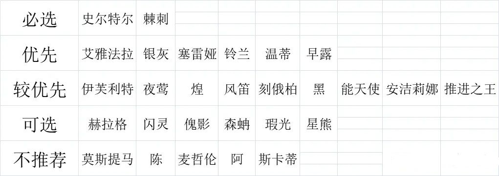 这些干员也是优先选自己没有的,但很多玩家缺少的可能不止一个,自选六星一般是补比较新的六星干员(比如史尔特尔,瑕光这样的),至于塞雷亚,银灰,小羊这种,虽然很强,但已经进过很多次店了,持有率也很高,就算暂时没有,也能通过公招或者黄票购买出来,所以下表中对于可以公招的干员下降了一个评级,这个表绝对不是强度表,望周知!