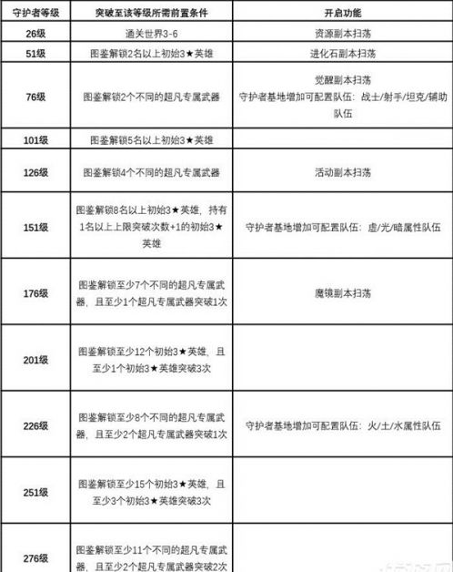 以下为各功能开启所需守护者等级,以及其相关前置条件: