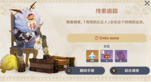 【奇怪的丘丘人】并不会每时每刻都出现在指定的地点,所以我们要了解用丘丘语是如何表达时间的,第一个【Unta nunu】表示深夜【24-6点】,【Mosi aba nunu】表示日落后到深夜,也就是【18-24点】,【Unta mosi dada】表示午后至日落前,也就是【12-18点】,【Aba mosi dada】表示清晨到正午,也就是【6-12点】;