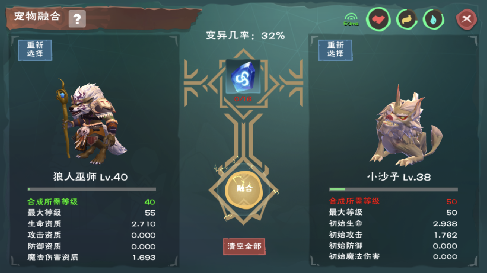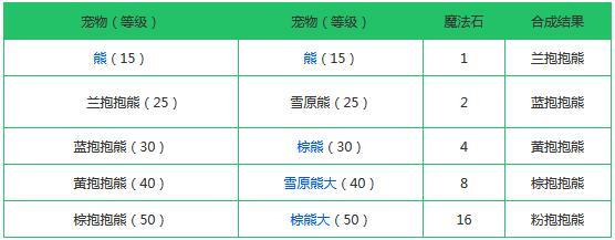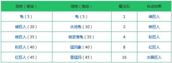 分别放入两只宠物,可以合成一直全新的宠物,并且概率发生变异。以下为宠物合成配方: