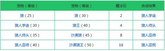 第二只出现的融合宠是狼人系,它的合成所需宠物倒是比较简单,就只是各种各样的狼,从普通的狼到狼王,除了雪原狼以外的每一只狼都需要参与进来,才能得到最后的巫祝。狼人与蝠龙一样,也是属于远程攻击类型的宠物,不过它的法力比较神奇,在没有合成的时候,狼王的攻击性似乎比合成后的狼人还要厉害,那是因为狼人有着更高级的技能,它们可以让你得到祝福,从而进行加成。因此,是否选择进行狼人合成,需要比对玩家各自的需求!