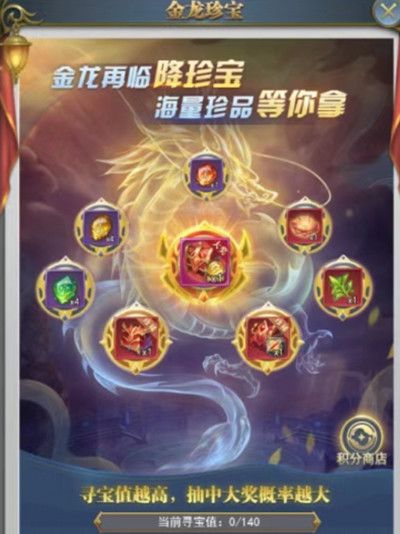 可通过单抽、十连抽(9折)进行寻宝,每次寻宝都可增加寻宝值,寻宝值越高,抽中大奖概率越高;抽中大奖后寻宝值清零,所有大奖抽完后,不可继续抽奖