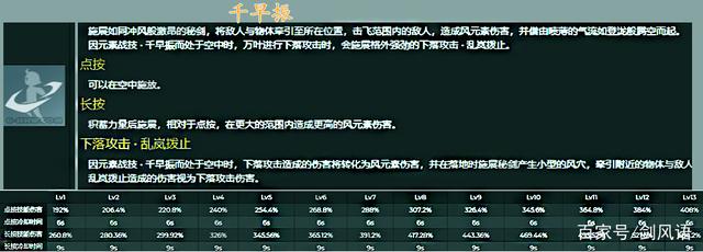 下落攻击 乱岚拨止因元素战技 千早振而处于空中时,下落攻击造成的伤害将转化为风元素伤害,并在落地时施展秘剑产生小型的风穴,牵引附近的物体与敌人。