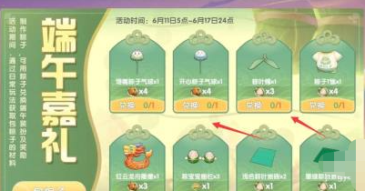 可获得开心粽子气球、粽叶包、粽子T恤、蛋黄肉粽菜谱、粽宝转角栅栏、浅色粽叶地砖、墨绿粽叶地砖、红云龙舟雕像等奖励。