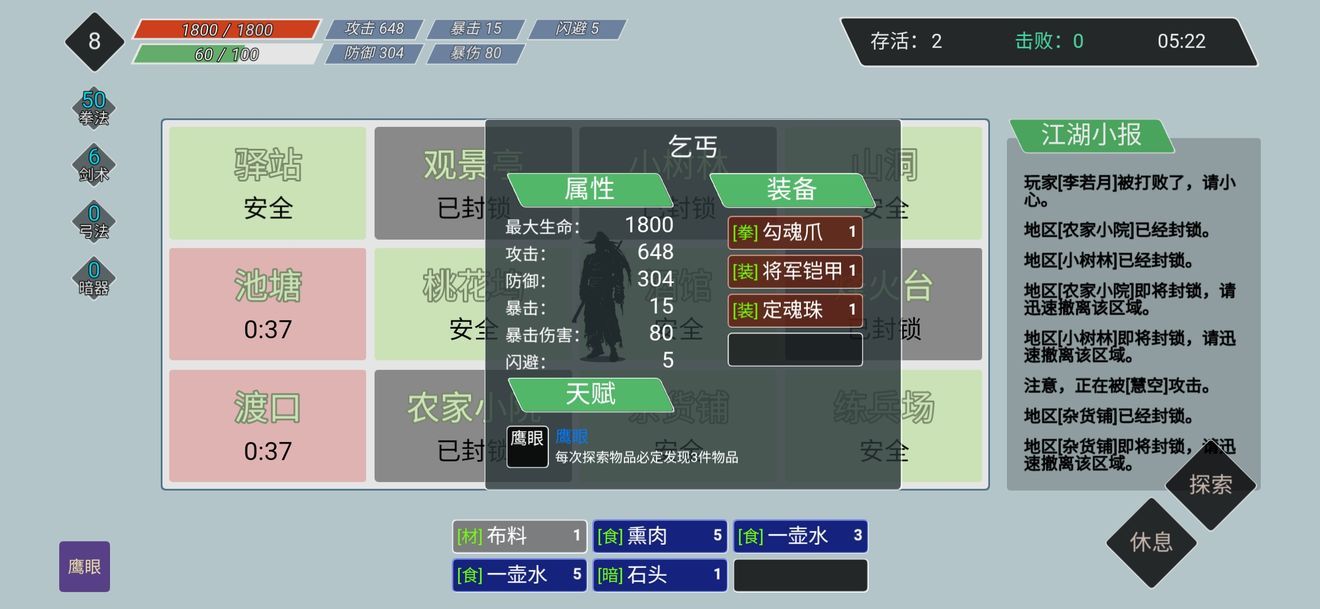 比如这局队友可能就不知道穿装备了,不是说捡到就是穿上了,一定要给他装上去才算穿。可以保留一个加血一个加体力,体力不够就用,别留着,不留也没关系,可以打坐,打坐加血加体力。针对缩圈倒计时,在最后10秒一定要出来,不要卡时间,不然很容易毒死,这个是倒计时结束,如果你还在就毒死。