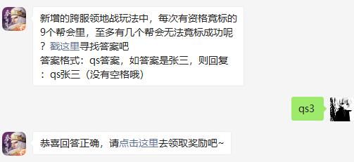 新增的跨服领地战玩法中,每次有资格竞标的9个帮会里,至多有几个帮会无法竞标成功呢?戳这里寻找答案吧