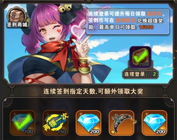 首先进入游戏之后,最简单的方法就是连续签到就可以获取钻石了,只要在签到商场里面,我们连续登陆可以提升每日领取签到币,签到币可以在签到商店兑换超值奖励,一天可以最多获取16000个钻石哦,当然大家第一天登录游戏可以获得100个钻石,第二天是150个钻石,第三天是200个钻石,到第五天的时候还是200个钻石,所以总地来说,签到获取的钻石可是不少的,大家如果对这个游戏不太敏感,就想收集钻石的话,请不要忘了每天登陆一下。