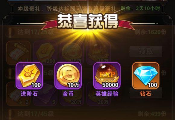 第二种就是冲级奖励了,进入游戏之后,一般都会有新手,初级奖励,目的是就是为了让你大家等级达标之后就可以领取限量的好礼了,但是会有一周的时间限制哦,大家一定要在这几天内尽快的冲一下等级,达到15级,可以获得100个进阶石,10万个金币,5万个经验以及大量钻石。25级,35级,45级都会有相应的奖励。