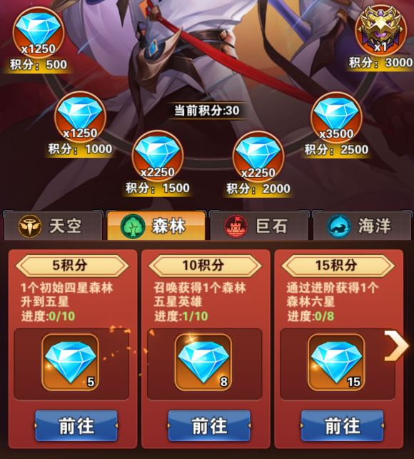 第三种获取的方法就是完成游戏里面的神将挑战,神将挑战一共分为四个阵营,天空,森林,巨石,海洋,每一个阵营里面都会有三个任务,完成之后会获取少量的钻石,然后就可以获取的积分,这个积分如果攒够500~3000之内,就可以兑换大量钻石了,500积分可以兑换1250个钻石,2500个积分可以兑换3500个钻石,所以说总共奖励还是很诱人呐,大家赶紧去做神将任务吧。