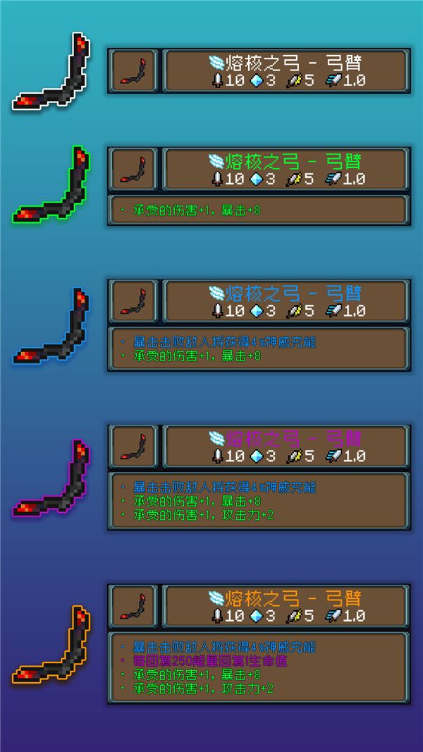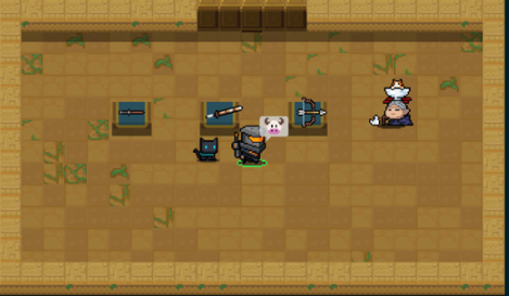 神器分为剑、弓、法杖三类,每一类都有15种武器,而每种武器会分成三个部件。在初始房间选择一把武器后,本次与更新后的冒险中便只会掉落该类武器的部件。