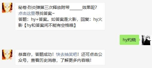 秘卷·烈炎弹第三次释放附带_______效果呢?这个问题是火影忍者手游微信公众号在2021年7月17日为玩家们出的每日一题,玩家答对即可获得抽奖资格获取奖励。不清楚这个问题答案的玩家,请看小编带来的火影忍者手游2021年7月17日每日一题答案吧。