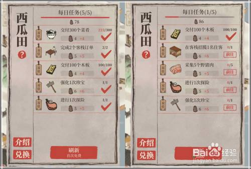 每天可免费刷新一次任务,之后需要花费铜钱、蔬菜刷新任务,每日共可完成4次任务,每页5个任务,可分别到不同州府完成,客栈任务在应天府完成即可。