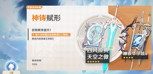 例:假设在某期武器祈愿「神铸赋形」中,5星武器「天空之傲」与「四风原典」为当期5星UP武器。
