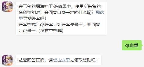 在玉剑的烟海神玉·绝效果中,使用所装备的名剑技能时,会回复自身一定的什么呢?戳这里寻找答案吧!