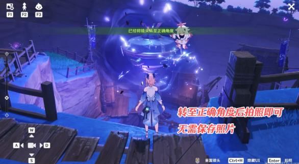 到达正确位置后,我们只需要面向「御影炉心」,之后打开拍照功能(左上角派蒙-拍照),转至正确角度后拍照。