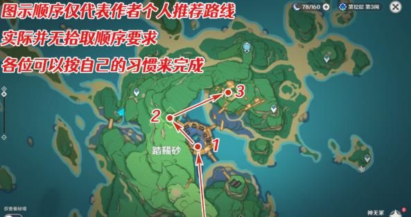 和当时放置信标一样,推荐各位旅行者先传送到南边的传送点,之后按照下图所示顺序从高到低依次取回,中途遇到的怪物可以无视掉。