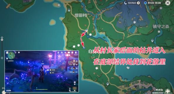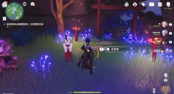 根据任务指引,我们直接传送到鸣神大社的传送点,之后从上面飞下来(南边或北边都可以),来到半山腰的裂口处找到花散里: