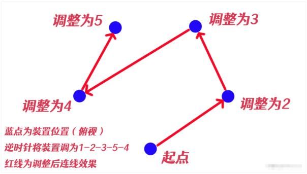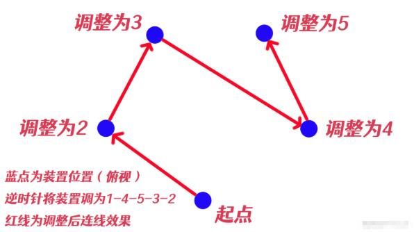 第二次俯视图如下图所示,蓝色圆点表示装置位置,旁边注明了调整方法,起点固定为1,红色连线是调整后启动机关的连线效果,可以看到和场地中显示的图形一致。