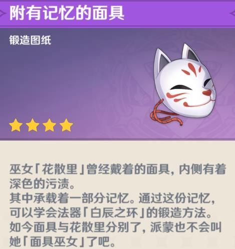 道具「附有记忆的面具」在使用后,会得到四星法器「白辰之环」的锻造方法。