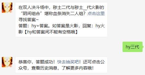 火影忍者手游的微信公众号每天都会给各位玩家带来全新的每日一题,只要你正确的回答出了答案就可以获得对应的奖励了。而2021年7月27日的火影忍者手游的每日一题的题目是在双人决斗场中,秽土二代与秽土__代火影的“阴间组合”堪称血条消失二人组?如果你想要知道这道题目的答案是什么的话就赶紧来这里看看吧。