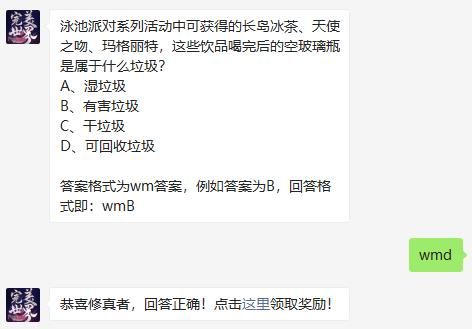 在完美世界手游最新推出的泳池系列的活动里面玩家可以获得非常多的饮品,而2021年7月27日也就是今天的完美世界手游每日一题的题目也是这方面的,这道题目就是泳池派对系列活动中可获得的长岛冰茶、天使之吻、玛格丽特,这些饮品喝完后的空玻璃瓶是属于什么垃圾?如果你不知道这道题目的正确答案是什么的话就赶紧来58免费资源网看看本文吧。