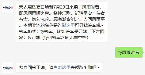 天衣惠选夏日焕新7月29日来袭!风雨时若,即风调雨顺之意。祭神乐歌,祈请平安;侠者有命,切勿沉吟。愿海潮皆能定,人间风雨平。本期奖池的名称是?戳这里可寻找答案哦~