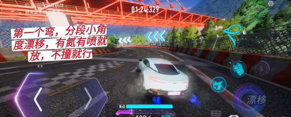 第一个弯,分段小角度漂移,有氮有喷就放,不撞就行。