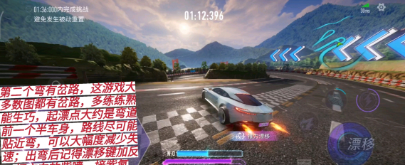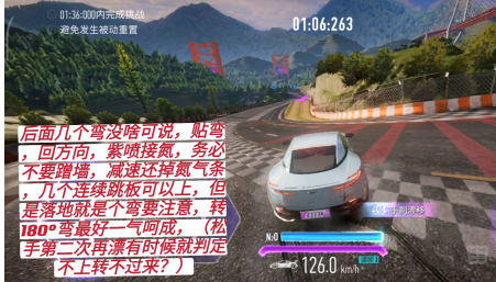 第二个弯有岔路,这游戏大多数图都有岔路,多练练熟能生巧,起漂点大约是弯道前一个半车身,路线尽可能贴近弯,可以大幅度减少失速;出弯后记得漂移键加反打方向放紫喷,接紫氮。
