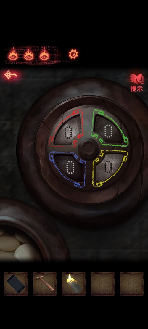 (按自己玩的顺序)到大巫贤那边,点右下角的香炉,看竹简上的字(阴阳之花、南墙之土、无根之水、巫贤之火)。正下边有个阴宅(小高潮出现),得指针。用手机照小人后面的墙,有字(壹-龙,贰-蝶,叁-鱼,肆-龙),开棺材,得石板。