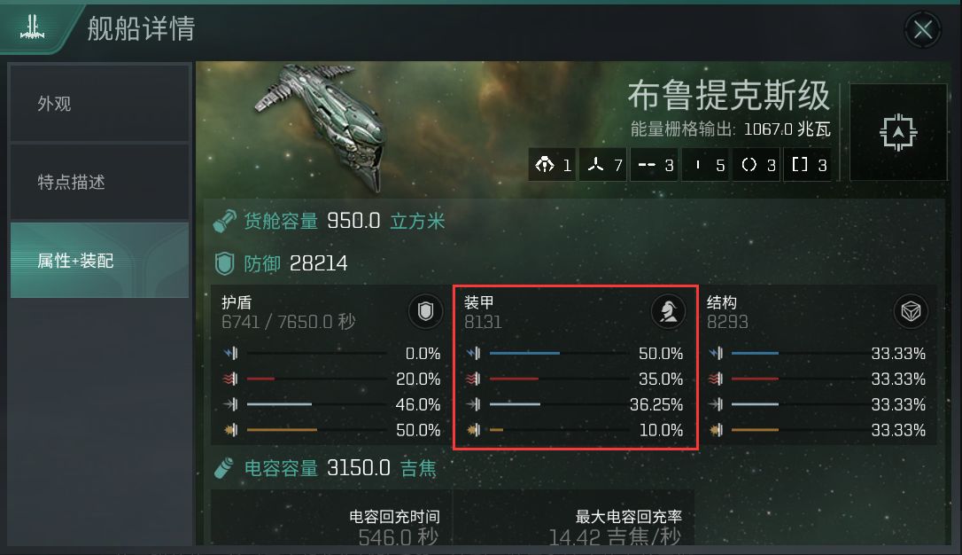 虽然布鲁提克斯具备每一级操作战列巡洋舰操作都会提高7.5%的装甲修量,但是其装甲抗性和装甲量都不如先驱者(虽然动抗要略高于先驱者,但是甲抗船更缺的往往是爆抗)。