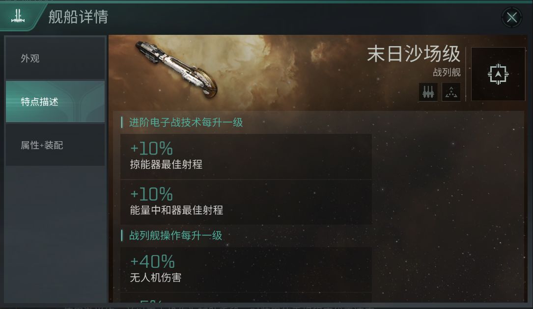 与灾难级不同,艾玛帝国的另一艘制式战列“末日沙场”级可以说是所有帝国势力中泛用性最广的电子战战列。与其他帝国不一样的是,末日沙场不是干扰敌人舰船的武器系统,也不是干扰速度,而是增强了自身对毁电系装备的应用。