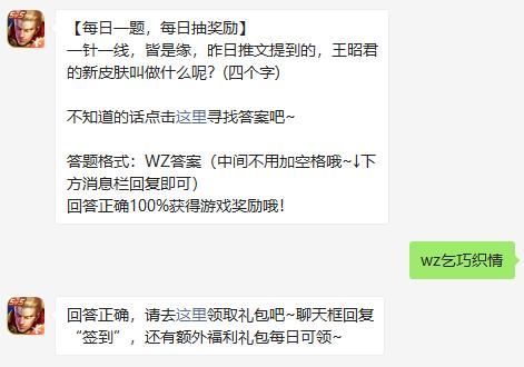 问题:一针一线,皆是缘,昨日推文提到的,王昭君的新皮肤叫做什么呢?(四个字)