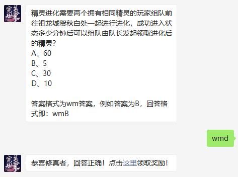 精灵进化需要两个拥有相同精灵的玩家组队前往祖龙城贺秋白处一起进行进化,成功进入状态多少分钟后可以组队由队长发起领取进化后的精灵?