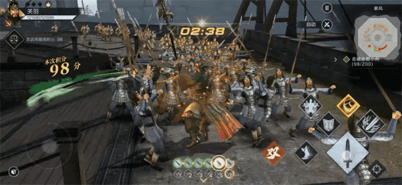虽然时间很短,但是在精于割草的大佬们面前都是小菜一碟。而且只要你技术够好,在完成任务指定的击溃数后,小兵们就会消失,取而代之的是场景中央气势汹汹的吕布。此时倒计时依然在走,你需要凭借炉火纯青的打斗技术迅速击败吕布,那将为你赢得30秒的额外时间!