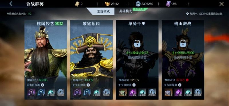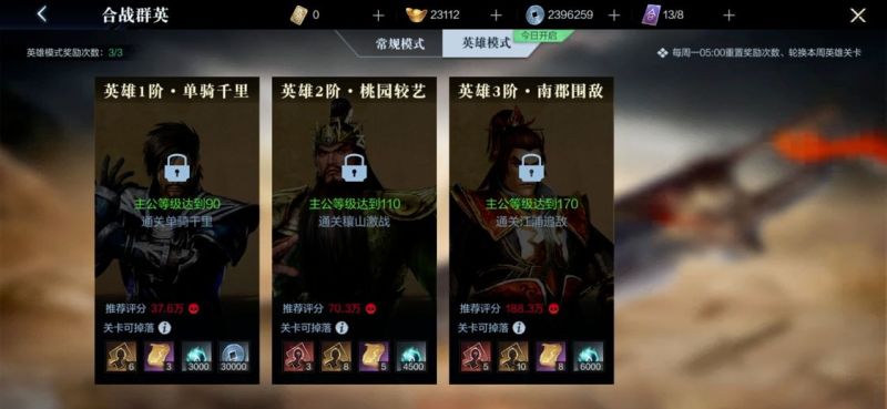 而在英雄模式中,每周的关卡将会不同,每周一进行奖励次数刷新与副本武将轮换。