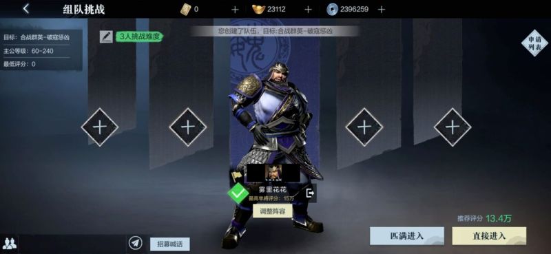大家可以创建一支五人小队进行挑战,当然《真三国无双霸》作为无双玩法,选择自己一人进行挑战也是可以的。不过人数越多,获得的基础奖励也将越多。同时该副本仅能上阵一名武将。