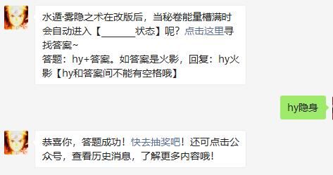水遁·雾隐之术在改版后,当秘卷能量槽满时会自动进入【________状态】呢?点击这里寻找答案~
