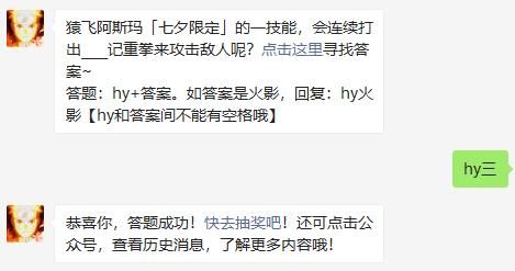 今天火影忍者手游新推出的每日一题的题目是猿飞阿斯玛「七夕限定」的一技能,会连续打出____记重拳来攻击敌人呢?这道题目对于没有这名角色的人而言还是确实会不知道的,大家快点来这里看看这篇文章吧。