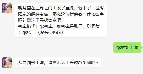 明月菌在三界之门击败了星魂,救下了一位阴阳家的姬姓贵裔,那么这位新侠客叫什么名字呢?戳这里寻找答案吧!