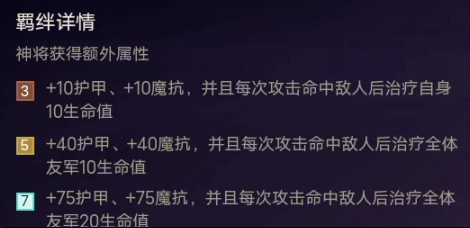 羁绊效果:①增加神将棋子双抗,坦度提升较大,②神将棋子普攻命中敌方就能给全员回血,增加团队续航能力。