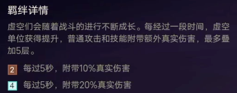 开局无效果,但5秒后虚空棋子就能造成额外的真伤(真伤无视护甲魔抗减伤),每过5秒就会叠加一次,可叠加5层,也就是说4虚空羁绊下虚空棋子在25秒后能造成额外100%真伤,如2星虚空恐惧技能伤害是400,释放一次技能就是400魔法伤害+400真伤共800伤害。