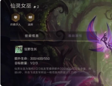 1、仙灵女巫是一个带控制的奶妈角色,技能有着强力的辅助效果,是为友军提高血量的上限,此外这个上限不会受到重伤效果的影响,还带有击飞附近的地方棋子效果。