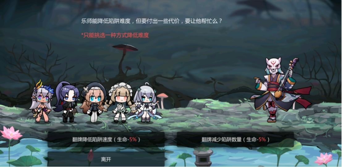 5.琴弓:自己选择一种方式降低难度,玩一次扣自己队伍5%的生命,(建议选择翻牌减少陷阱数量,只能减少一次)