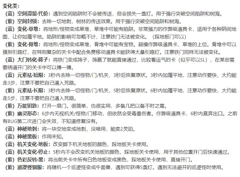 效果各异的卡牌,可以在探索中给予帮助,甚至有作弊级别的卡牌。道具卡可以带入下一次冒险。请牢记:使用道具卡的最终目的是省下灯在关底换取更多宝箱,强力道具卡建议留给以后的高收益关卡中使用。
