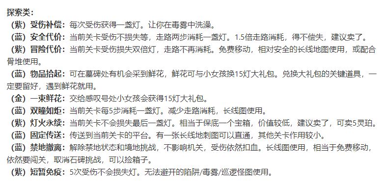 引路灯礼包·小/中/大:分别获得4/8/15盏灯,用于关底兑换宝箱。是最有价值的道具卡