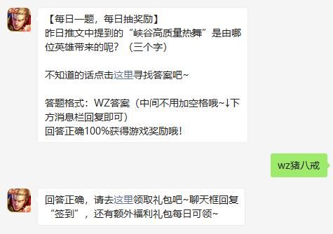 昨日推文中提到的"峡谷高质量热舞"是由哪位英雄带来的呢(三个字) ?这是王者荣耀2021年8月25日微信每日一题的最新问题,各位亲爱的农药游戏玩家都知道这道题目的正确答案吗?小编已经为你准备好了,赶紧来看看吧!